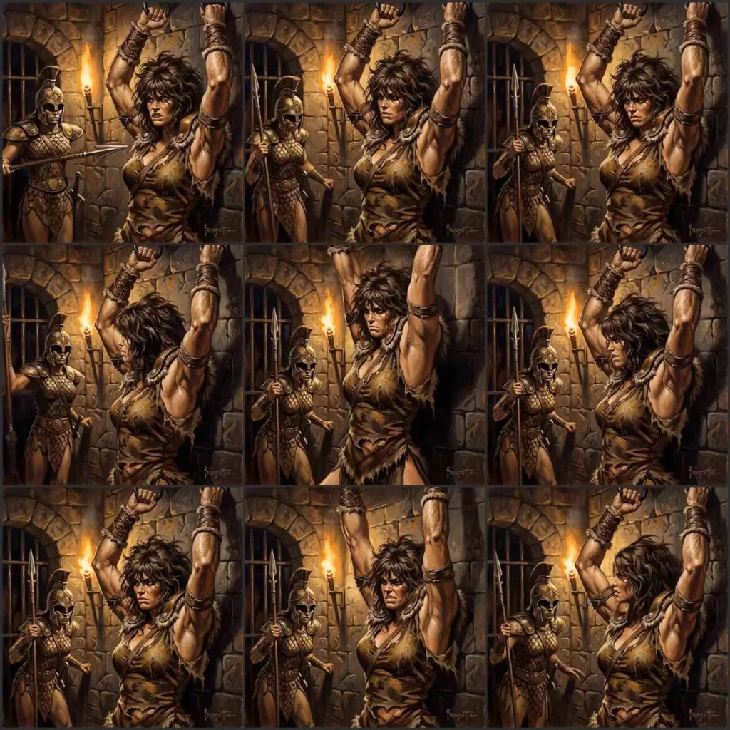 A Captured muscled warrior woman is held in a dark dungeon