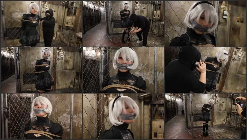 Yui is a popular cosplayer in Tokyo who is attending a videogame show. Wearing her cosplay of the super popular character 2B, she is ready to have a good time, but in her way to the venue she gets lost. After taking a couple of wrong exists she gets deeper and deeper into the underground tunnels of Shibuya, until she finds herself in a long underground chamber. Looking for the exit, Yui finds a mysterious woman, wearing black hoodie and covering her face. When Yui asks her for the exit, the woman grabs Yui and overpowers her and ties her hands behind her back. As the woman ties Yui to a metal fence, she explains her that she is a criminal who hides in those tunnels until very late at night when she emerges to the streets of Shibuya to rob in some of the fanciest stores. And because Yui has found her hideout, now she won’t let her go! The woman gags Yui with duct tape, so tight it marks her lips, then leaves her tied to the metal fence as she leaves to commit her robberies. Yui struggles and tries to scream, but the gag muffles her pleads, and the ropes are too tight to get loose! Includes behind the scenes.