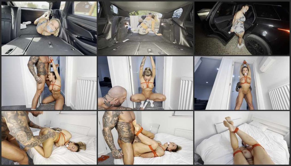 Jenna is enjoying a brisk walk but she takes a wrong turn down a cut way. She’s a little unsure where she’s going but proceeds anyway. Little does she know a man comes up behind her, puts his hand over her mouth and pulls her away. He then puts her into the boot of his car, tapes her mouth shut with duct tape and hog ties her with tape around her ankles wrists and into a hog ties. He drives off whilst Jenna is tied, she struggles helplessly trying to break free. Finally she succeeds. She keeps quiet in the back of the car after removing all tape including her tape gag. She waits for her capture to open the boot and makes a run for it but she’s unsuccessful and he grabs her once again and throws her back into the boot of his car. After driving around he finds a secluded spot where he can really have some fun with Jenna. He lies in the back of the car & Jenna sucks his hard cock, drooling and spitting all over him as she gags and moans.