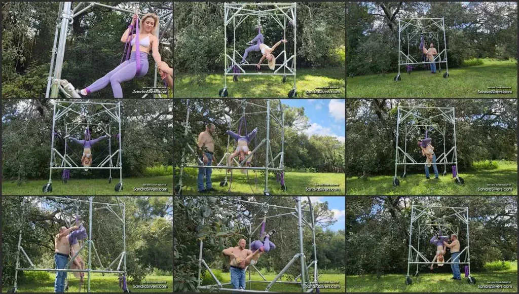 Zonah Bellum’s aerial prowess meets its match as Ben, broad shoulders shirtless above trademark blue jeans and black boots, grips her inverted form, pulling her into predicaments with commanding hands. Zonah’s spandex leggings-clad legs, thighs and buttocks become wrapped in rope like a vice, the fabric shimmering under the sun, while her bikini top strains to contain her upside down C-cup tits, pulled to earth in gravitational vulnerability. Purple ropes entangle her body, linking her to the wheeled structure of steel, as she hangs helplessly in M.O.N.S.T.A.R. ‘s arms – a sensual siren seized within serenity, her restraint brings a surge of relief, rope allure amplified in this asked for outdoor ordeal.