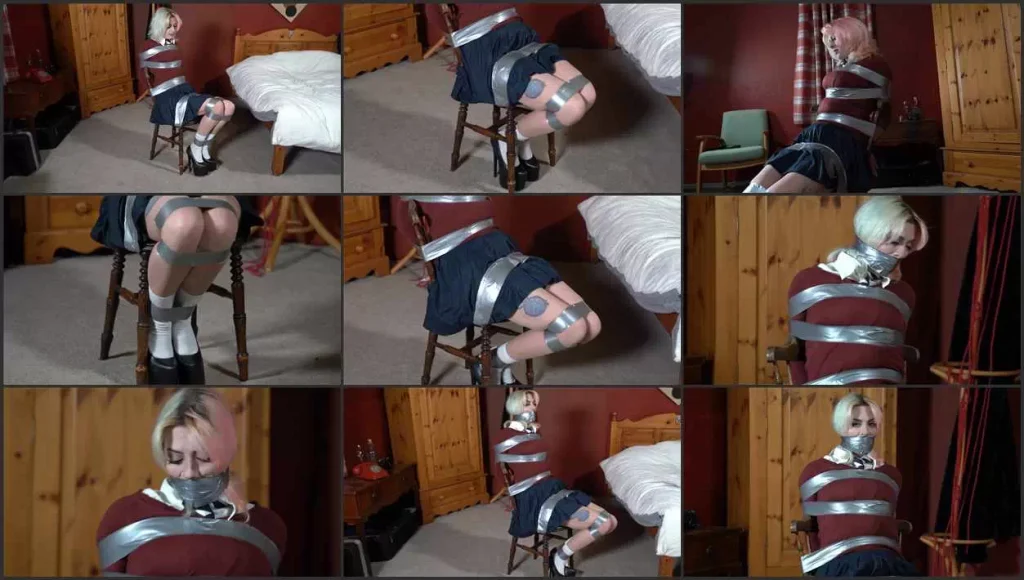 Amber gets back early from her henparty. the theme was uniform and she is still wearing it when we tape her to a chair. A full wrap gag of duct tape is used.