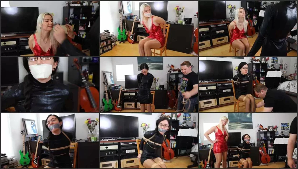 Angelica Coralvine is a sexy femme fatale, wearing a shiny red dress. She is handcuffed, sitting on a chair, finally captured by detective Khrystal who interrogates Angelica, but all Angelica says is that by the end of the day, Khrystal will be the one tied and gagged. This threat makes no sense for Khrystal, how could Angelica escape from the handcuffs? still Angelica talks so proud and self assure that Khrystal will be the one tied and gagged by the end of the day. Khrystal can’t get any more information from Angelica so she gags the blonde with microfoam tape and leaves her there for a while. When Khrystal is back she gives Angelica another chance to talk, and removes the micro foam tape, but Angelica keeps repeating “at the end of the day, you’ll be the one tied and gagged on this chair”. Finally Angelica tells Khrystal to check her phone, Khrystal notices a message and when she opens it there is a photo of Mina Salome, her partner in the LAPD, tied and gagged. Angelica tells Khrystal that she took the precaution of taking Mina captive and now she demands Khrsytal to untie her. Khrystal unties Angelica, and Angelica cuffs Khrystal then gags her with the microfoam tape. Angelica kisses Khrystal on the lips over the tape and then reminds her that she told her at the end she’d be the one tied and gagged. After a while Angelica is back with her partner in crime, they uncuff Khrystal only to tie her up with ropes and gag her with duct tape. Angelica laughs, she made a promise: at the end Khrystal was the one tied up in that chair!