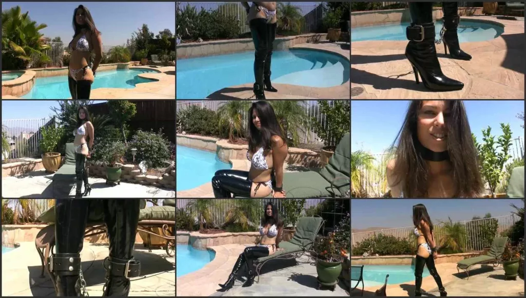 The day was warm and sunny. Julia was over and we felt like being outside. She mentioned she had a new bikini, and I had new crotch high boots in her size. Julia was quite pleased with them, as well as the locking collar to wrist rigid bar restraint, and leather cuffs and chain ankle hobble. A bit of fetish dress-up and a bit of bondage, or a lot of it, always gets Julia’s motor running, and going outside that way is a particularly pleasant adventure for her. I asked her to strut about and do what she pleased. What pleased her was taking the viewer on a tour, and along the way sharing her feelings about her current situation and her fetish inclinations in general, and what she might like to do if you were there with her. She shares secrets about what brings her pleasure, and despite her somewhat restricted state, Julia’s dominant side clearly emerges. It is a rare and honest glimpse into the mind of a gorgeous model with a voracious affinity for the bondage and discipline lifestyle. Shot POV style, and not exactly steady cam at times, but I did my best to keep up with this switchy bound beauty to make what amounts to a Julia personal ad feel like it was meant just for you.