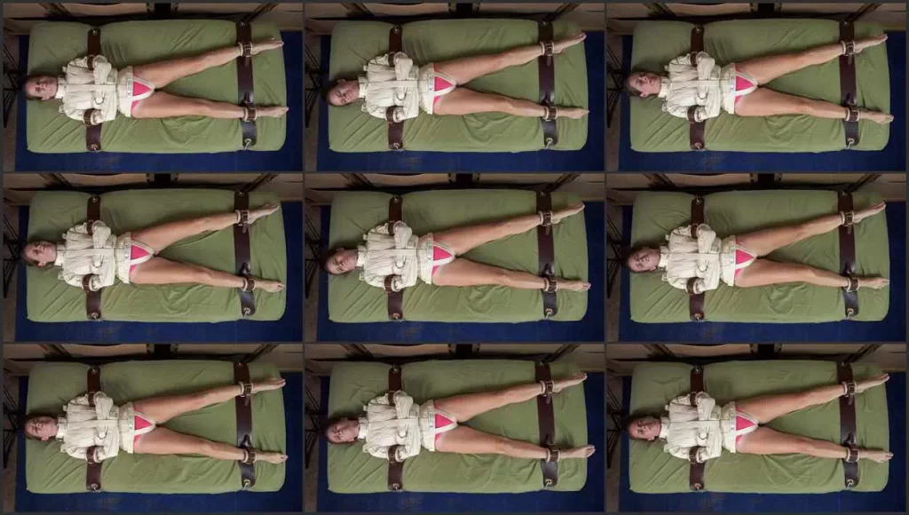 Alyssa Night is trapped in an extra small straitjacket and strapped to the bed with leather hospital restraints. Her frustration builds as she struggles but there is no way out. Filmed from directly above.