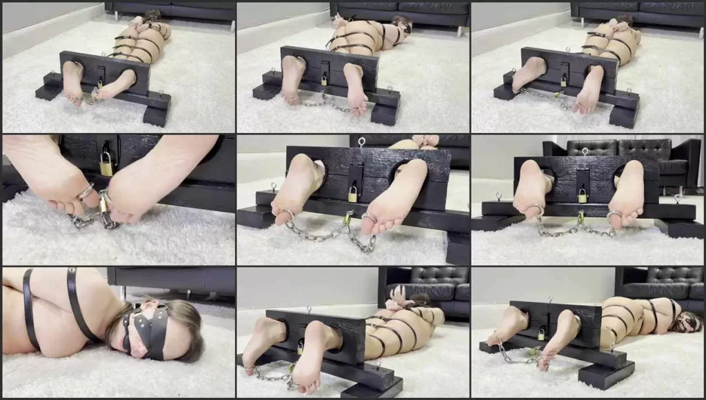 Watch me bound in belt bondage, ballgagged, blindfolded, sexy soles in ankle stocks, and toes tied in chains. This delicious foot fetish scene shows plenty of struggling.