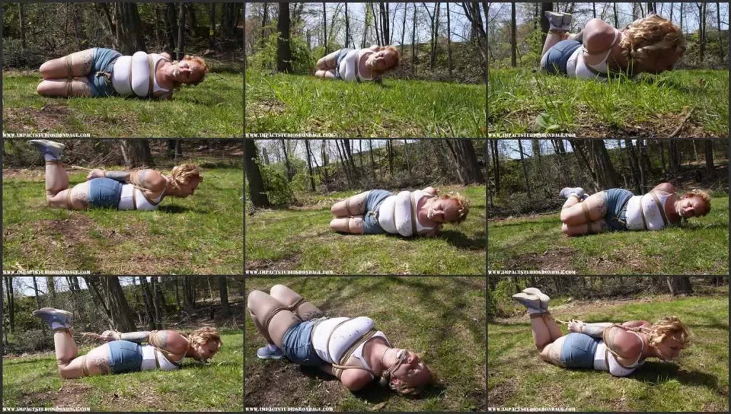 Wandering lost in the woods Vivica finds herself trespassing onto the wrong property! Vivica is suddenly surprised by a noise behind her and she soon finds herself tightly hogtied, elbows welded together, tight crotch rope firmly in place and her mouth properly stuffed with a dirty rag held firmly in place with tape fully wrapping her head. Alone and left to struggle alone in the woods.