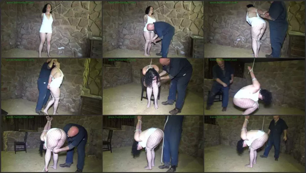 Minuit struggles in the dungeon with her elbows crushed together behind her back, bound in ropes. Her neck is tethered to the stone wall by a rope leash and a knotted rope has been pulled between her teeth and tied around her head to keep her quiet. Minuit pulls at the rope tethering her to the wall and tries to reach around with her flailing hands by the knots are out of reach. The Hunter comes in to begin her torture, he ties her wrists together behind her back. Minuit kicks at him so he ties her knees tightly together then frees her neck from the wall. He leads her to the center of the chamber and sits her on a high stool. The rope leash is pulled between her bound knees forcing her head to down and her chest to her thighs. A rope is pulled down from an overhead ring and run between her bound wrists. He pulls her wrists up high behind her back in a strict strappado. Minuit curses and swears through her gag in defiance before he pulls the stool out from under her ass. She scream and groans in pain as her arms are pulled up high behind her back and she is XXXX to squat with her neck tied to her knees. The Hunter goes over to the wall and grabs a black leather flogger, Minuit struggles to move her ass as he begins to whip her ass with the flogger. She twists and turns trying to avoid the blows but the Hunter lands a few good ones on her ass. He soon tires of chasing her ass around so ties a crotch rope between her legs then pulled the end of the crotch rope up her ass and ties it to another ring in the ceiling.