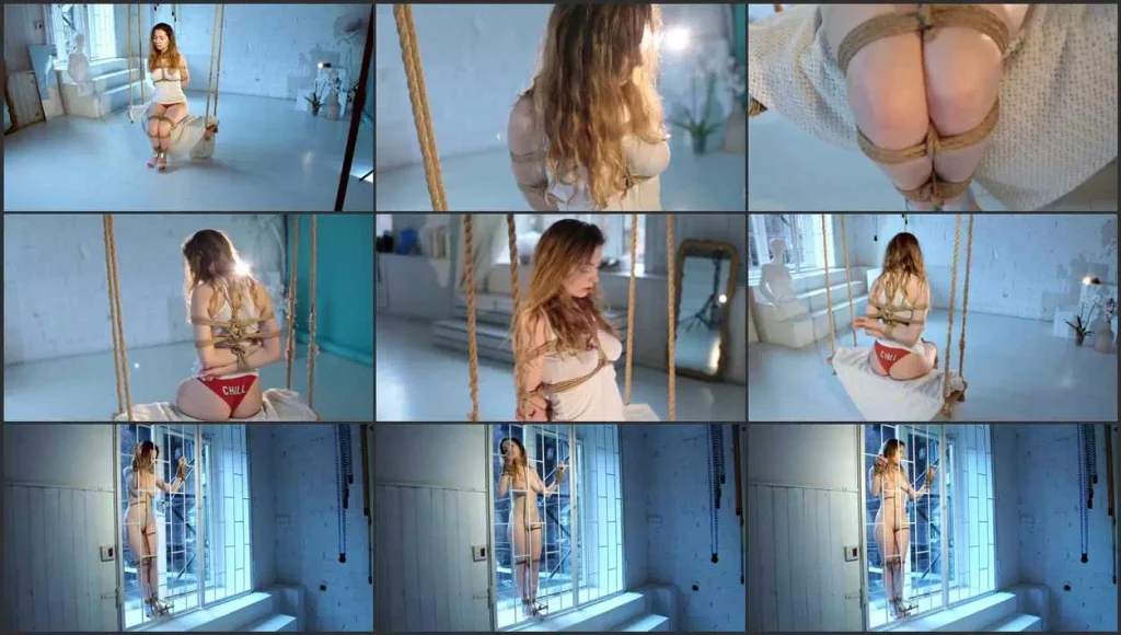 Bound girl sitting on a swing. It is connected by reliable jute ropes. The girl enjoys her state of bondage swaying on a swing. Then it is completely naked tied to the window grille. I wonder if people in the neighboring houses will see a naked bound girl in a lonely window.
