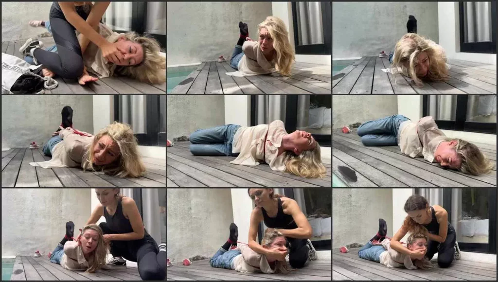 Rebecca Nurse (victim) comes home from work. She gets out of the car and goes to the front door and wants to unlock the door. While doing so, Angelina (Bully) sneaks up behind Rebecca and covers her mouth, pulling her into the house. But after a small fight Rebecca has no chance against Angelina.Rebecca tries to scream but she has no chance because Angelina covers her mouth. At some point someone stands in front of Rebecca’s door and rings the doorbell (letter carrier or someone else). Rebecca is lying on the floor in front of the door in the house, clutching Angelina’s legs and arms and can’t scream or open the door. Angelina ties her up with a pantyhose, Rebecca wakes up slowly and realizes that she is tied up.