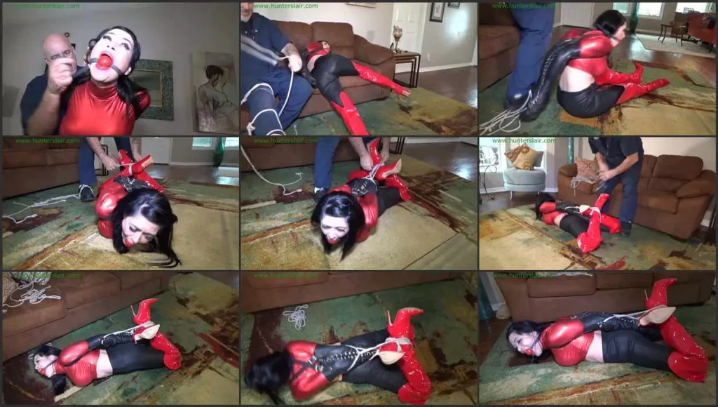 Busty MILF Luna is pushed into the living room in her shiny red over the knee boots with her arms trapped behind her back bound in a tight leather arm binder. The strict leather sleeve covers her arms from her hands to her shoulders. Her bitching and complaining is cut short when the Hunter stuffs a big red ball gag into her mouth spreading her jaws painfully open. He then wrestles her to the sofa where he grabs and spanks her spandex covered ass as she kicks and screams in protest into her gag. She struggles and wriggles her knees off the sofa and onto the floor as the Hunter pulls out some rope. He rolls her over onto her belly and crosses and ties her booted ankles tightly together. Then more rope is attached around her leather bound elbows then run down to her crossed and tied ankles. Luna grunts and cries into her gag as she is strictly hogtied with her stiletto heels pulled up close her her ass. The to her XXXX he lift her up onto her knee points and taunts and teases her as she screams in terror as he plays a balancing game. Luna is helpless to stop him as he tries to balance her on her knee points, each time she loses her balance and begins to fall over only to be caught at the last minute by the Hunter as he tries a few more times to balance her on her knee. He finally tires of the game and rolls her back over onto he belly and leaves her alone to struggle helplessly bound and gagged.