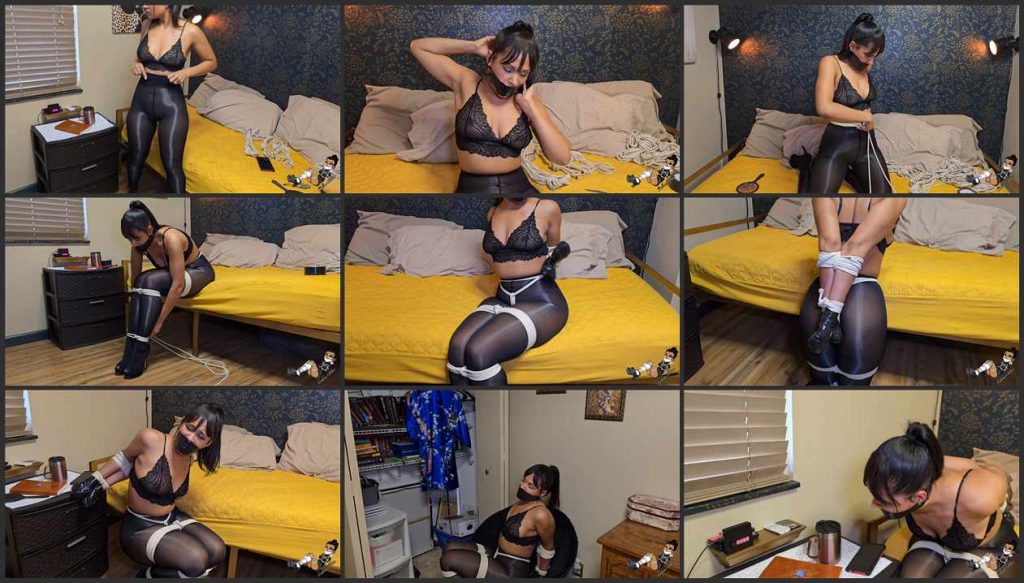 Bo bought Calisa a sexy new ring for their anniversary so she wants to make sure to give him something just as special. She knows how much Bo loves when she’s in bondage. The longer she’s bound and gagged the better. He won’t be home for another 24 hours which is PERFECT! She plans to be tied up for the entire 24 hours as a surprise for him. He’ll be so turned on when he gets home from work and finds out she’s been tightly roped up for 24 hours just for HIM! Calisa explains all this to a friend over the phone and asks her to come complete the bondage and lock the door to ensure she can’t go back on her decision. She starts by changing into pantyhose, a bralette and heels. First things first, she stuffs a large sponge in her mouth and wraps it with tape. Then she ties a crotch rope, thighs, knees, ankles. Her friend arrives just in time to complete her bondage by tying her elbows tightly, her wrists and then taping her hands. At first Calisa enjoys the bondage but after a few hours of being unable to do anything but struggle she starts to get upset. She decides she may need to end this little fiasco but can’t get out of her ropes. She tries her phone but she can’t use her hands. She tries to open the door but it’s locked. A few more hours go by and Calisa is really at her wits end. She wants this to be over with! What a dumb idea! She’s been searching the room for a way to free herself and just so happens to find a pair of scissors in the closet! But they’re strapped to the shelf. She reaches up with her tied arms behind her but there’s no point since her hands are balls of tape! She’s quickly losing hope! Now with a little under 4 hours until her husband gets home Calisa doesn’t know whether to be happy, sad or angry. Instead she decides she’s just tired. She’s been going at it for 20hrs and she’s exhausted. Maybe if she closes her eyes and rests a bit her husband will be there when she wakes up.