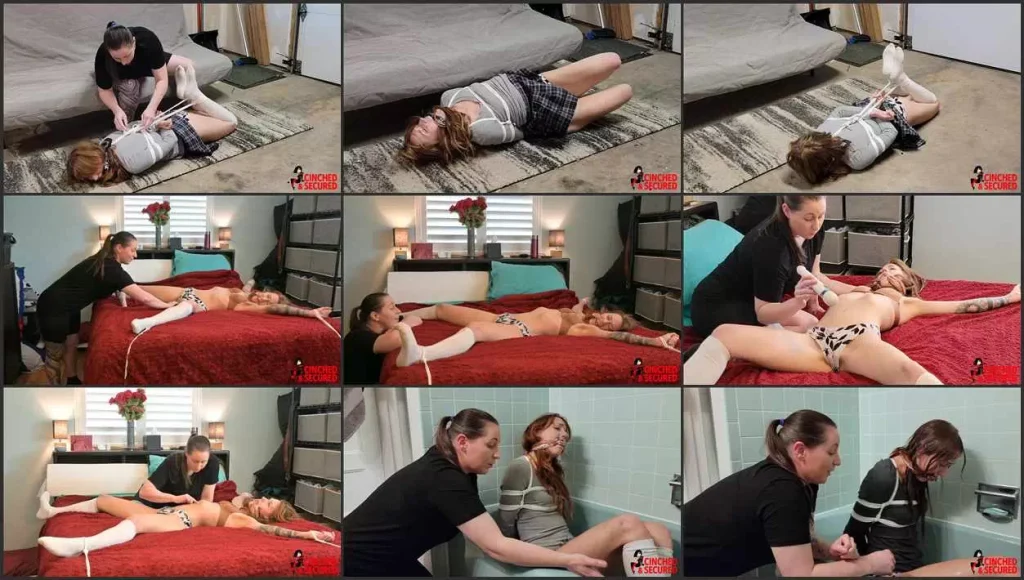 Cara Day thought her nightmare was long in the past, but the crazy woman who had captured her months ago and left her in a running bathtub was back! Capturing Cara once again, she left her hogtied on a dirty garage floor, cleave gagged and helpless, her skirt riding up to show off her panties as she writhed on the dirty ground. But that was only the beginning! Her tormentor ties her spread-eagled on the bed, with only her bra and panties to shield her modesty. Poor Cara was fondled by the sadistic woman, then tickled until she screamed with laughter behind her gag. Finally came the moment Cara had dreaded. Her assailant pulled out a vibrator and teased and edged Cara without mercy. Finally, she made the bound beauty cum, and Cara’s body wracked and shivered, her moans of pleasure muffled as the intruder clamped a hand over her mouth! Then the intruder slipped the vibrator into Cara’s panties, leaving it running at full speed! As Cara was left helpless, she tried to will her body to resist, hoping to stave off any more orgasms. This displeased her captor, who decided that Cara needed cooling off. She tied the girl up in the shower, soaking her from head to toe, and left. Could Cara escape once more?