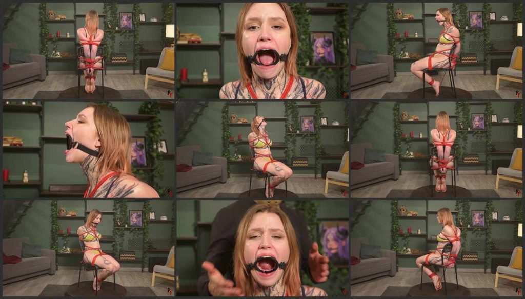 In this clip, barefoot Astrid is tied to a chair in her bikini, secured with bright red ropes. Her mouth is wide open with an oversized ring gag, stretching her lips to the limit and keeping her from relaxing – drool slowly drips as she struggles to endure the intensity.