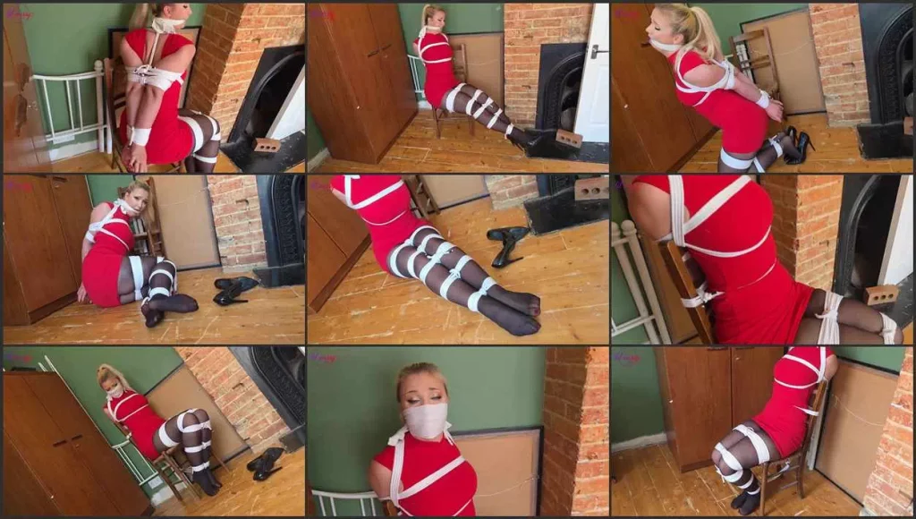 This video includes a lovely OTN gag which really highlights my big damsel eyes. I’m wearing a smart short red dress, black pantyhose and black high heels. I’m tied with white rope and gagged with a white cleave gag. I start sitting on a chair, with my elbows tied tightly together and lots of rope on my legs in particular. I struggle for a few minutes before moving down onto the floor, kicking off my high heels and struggling for another few minutes. There’s lots of lovely shots of my pantyhosed feet and matching red painted toes.