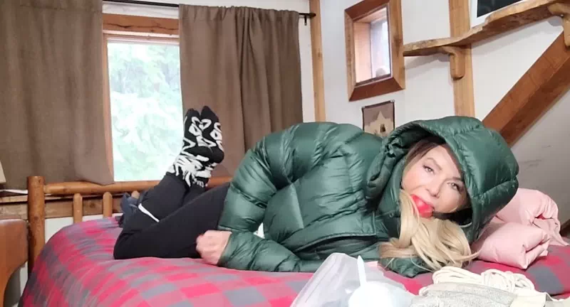 Watch as she is pulled away by hand over mouth by her boyfriend and taken into another room to serve her punishment by bondage! Watch as she is boob tied, hand tied, legs and feet tied by white rope! All bound up tight and naked she is left to struggle in her bound bonds. She is also over the mouth gagged to keep her quiet.