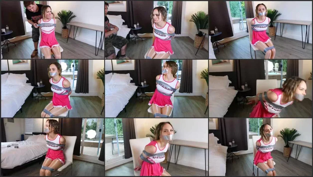 Blake Lavista, the most popular cheerleader in school, is ready to go to the annual cheerleading tournament, but after getting ready in her home, an intruder grabs her and ties her up. Blake protests, the man explains her that another cheerleader hire him to keep her away from the competition at least for a few hours so she won’t win. He ties Blake tightly, then gags her with a stripe of duct tape. Probably she won’t be able to get free, and nobody will be at her place in a couple of hours, enough time to lose the competition. Blake struggles, screams, jumps around, but she’ll stay bound and gagged!