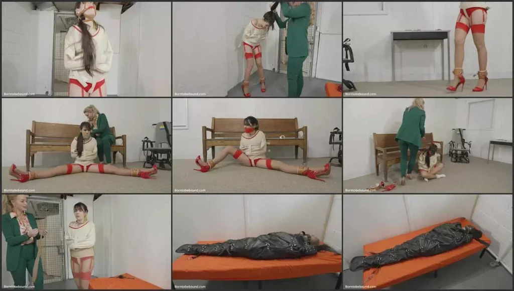 Ziva Fey is straitjacketed with a harness ballgag, shiny pantyhose with full bottom panties over top, seamed stockings and 5″ heels. She struggles on the bed and paces in the cell. The institution manager JJ enters and tells Ziva that it is time for some rec time. The harness gag is removed and her mouth is stuffed with a scarf and her head is wrapped with microfoam. A short chain is connected to her leather ankle cuffs and the two leave the cell. Ziva gets collared. The collar is attached to a short chain which is attached to the ceiling. She paces about in her 5″ heels. Next it is time for some stretching. The chain between her ankles is removed and she sits down in front of a long wooden bench where her ankles are chained off so her legs are spread. Another chain is attached to the back of her posey straitjacket and attached to the bench. The woman then wraps red electrical tape around her gag. Ziva struggles like that for a bit before her high heels are removed and white ankle socks with red trim are placed over her stocking clad feet. The gag is removed and a leather pillow gag goes between her teeth. She then is dragged away back to her cell. Ziva sits on the bed gagged awaiting her sleeping bag. First Ziva gets both legs into one big stocking over her little white socks. The pillow gag is removed and a stocking cap goes over her head. Now it is time to slip her into the heavy duty leather sleep sack. Once inside the pillow gag goes back in her mouth over the stocking cap as well as a leather blindfold. The leather sleep sack is attached to the bed in all four corners so Ziva can’t roll off and hurt herself. She is then blinfolded for rest.