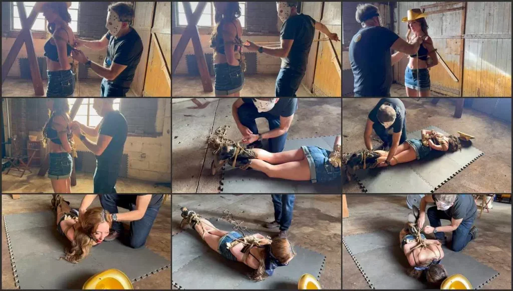 At the kinky cowboy bar, Ama Rio dons a classic cowboy outfit, complete with a rugged hat, red bandana, and a tube top that accentuates her curves. Her gloved hands are adorned with a buckle belt and she rocks thigh high stockings under her denim miniskirt. The sound of her leather cowboy boots clicking against the floor adds to her alluring presence. With a sly smile, she hands over several hanks of jute rope to her captor. Slowly but confidently, she begins to stretch and pose, showing off every detail of her outfit. As she places her hands behind her back, we see her bound in a tight boxtie on screen.