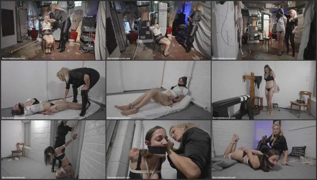Trixie is now heavily cuffed up in a makeshift cell still gagged. The woman films her a bit and removes the gag in hopes of finding out who sent her but with no luck a black fabric is used as a cleave but since she is struggling so much she is told to lean up against the pipe, more cuffs are added and the gag is wrapped around the pipe. Once the woman is out of site she slips down the post slipping free of the cleave gag which didn’t prove to be a smart move…