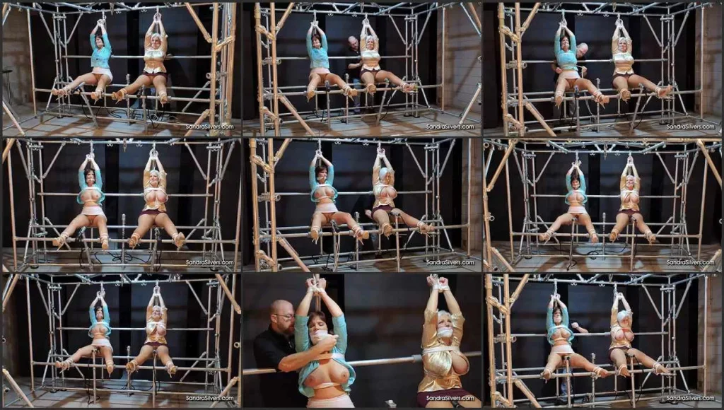 In the cold, humming heart of The Silverdrome — a cavernous, retro-futuristic warehouse lab pulsing with neon shadows and the faint scent of steel polish — two curvaceous MILFs of the bondage elite are suspended in Ben’s latest engineering marvel: the D.R.E.A.D.K.N.O.T. — The Department of Bengineering’s Damsel Restraint Erection Applying Diverse Kinesiology, Nefarious or Tempered. Behold Syren DeMer, raven-haired temptress in a form-fitting blue satin blouse, and Sandra Silvers, your sultry silver-haired goddess draped in a shimmering gold blouse — both seated upright in a state-of-the-art steel bondage frame that cages, controls, and consumes their luscious hourglass frames. Their wrists are lashed, arms above their heads, thighs spread and pinned apart by cold chrome bars — a perfect display of restraint and revelation.