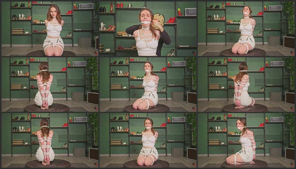 In this clip, I’ve tied Tilda with lots of white ropes in a kneeling position. She’s placed on a turntable that slowly spins her around its axis, giving you a full view of her from every angle.