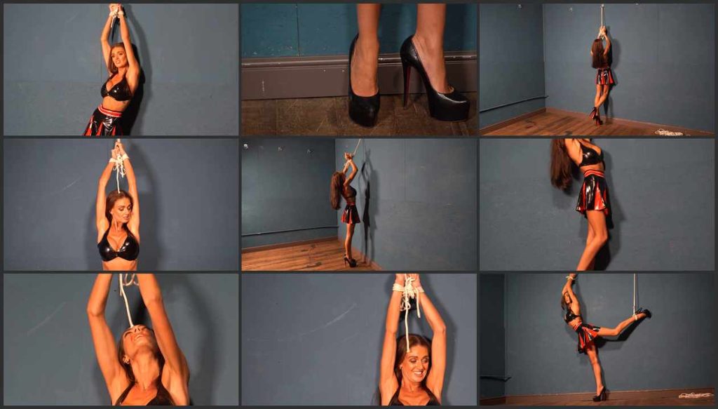 Emma is wearing a latex cheerleader outfit and is tied to the wall. Balancing on her heels she is also put onto one leg!