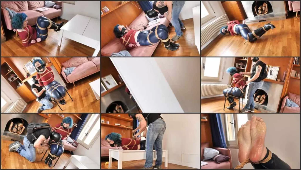 Emma loves to spend the days of cold and windy weather, at home alone, dressing in her favorite trousers, blue leather very tight, and wearing her black stiletto boots also in leather; she loves to caress her thighs and ass, wearing her favorite garments, and above all she loves to read her precious collection of bondage comics, read the plots of these women who in their cozy homes are surprised by a rough intruder, tied, gagged, robbed but also heavely groped in their prosperous boobs, and in their ass so firm, round, abundant and juicy, she loves to read about these modern heroines who wriggle furiously to free themselves from the ropes that cinched their bodies so sexy and statesque, she loves to read about how these women who with flebile muffled moans try to attract the attention of a hypothetical prince charming, through gags so tight and constricting as to inflate those cheeks and make them attractive and red, partly out of embarrassment, partly because of the excitement that a brute has turned his attentions to them. Emma loves all this, and then she loves to close her eyes and imagine that instead of these young ladies, there is her, and she loves to think that at any moment a muscular, rough and masked man will break into her apartment, and with the worst intentions, fix her as a naughty fetishist lady like her deserves to be kept still and quiet.