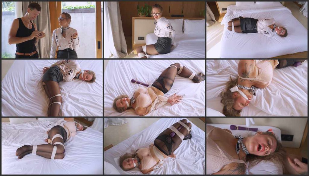 A real estate agent comes to the next house to check the property for a future deal. She strictly inspects the apartment and notices tape rolls in the bedroom. The woman immediately understands that the owner wants to hide problems with water pipes or even some more serious repair work from her! She asks direct questions to the owner, but his answer and reaction turned out to be completely unexpected and unpredictable! He wraps her tightly with duct tape, her arms and legs are firmly taped so that she can hardly move. She is also tapegagged. She is lying on the bed and suddenly notices that such tight bondage gives her pleasure. The man unbuttoned her blouse and took off her skirt! Such exciting impudence! She breathes languidly and looks very sexy with her glasses on the side. The owner of the house continues to show the realtor how he uses the tape and attaches a vibrator between her legs to make her sudden bondage unforgettable.
