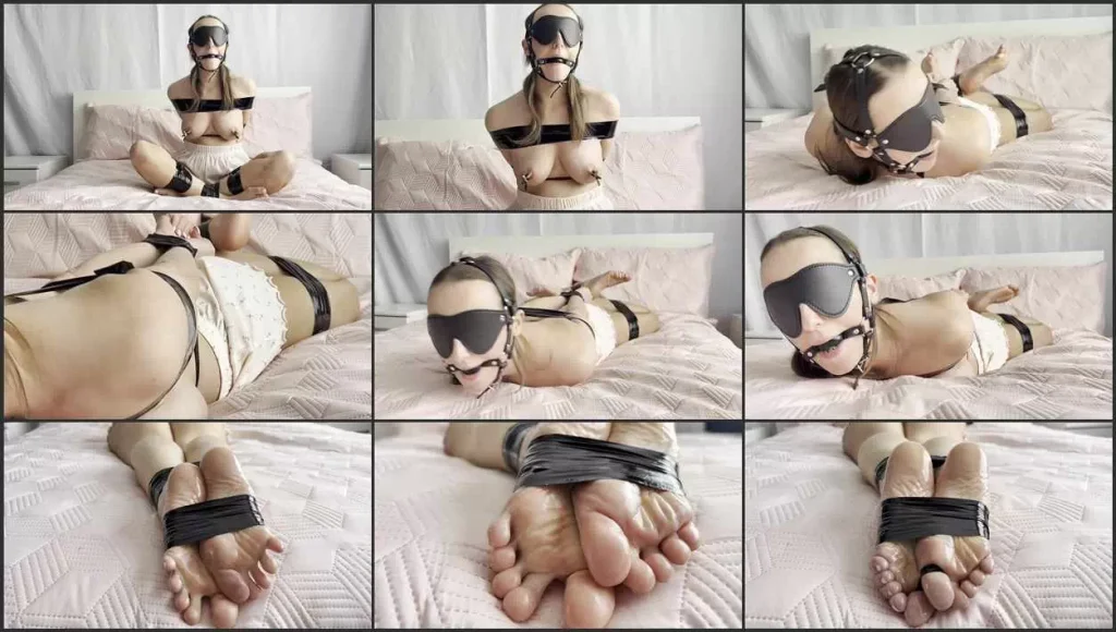 I am bound tight in tape bondage, my boobs and tits completely exposed while my nipples are pinched by nipple clamps. I’m ballgagged and blindfolded, fully restrained and tied up so I can’t escape, struggling against the tape that holds me in place. Every movement makes the clamps tug harder on my nipples, and I can feel the helplessness of being stuck like this. My feet are barefoot, soles shown off and toes wiggling for any foot fetish lover who wants to see me tied up and struggling in bondage.