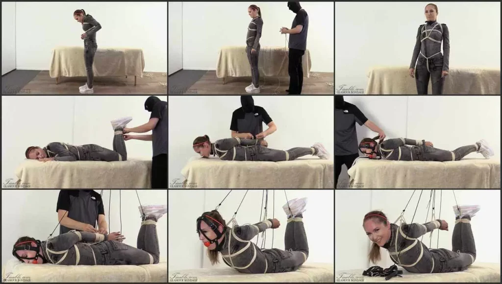 A fan wanted to see me use these ratchet pulleys on Rachel Adams. He supplied enough of them to make a really interesting position. I lifted up Rachel’s shoulders, wrists, ankles, and head with these handy pullers. And the fun part is: you can make them tighter and tighter, click by click. Rachel was having a really hard time in this extreme hogtie, but she is the toughest bondage model I know, so I even added a shock collar to tease her a bit more!