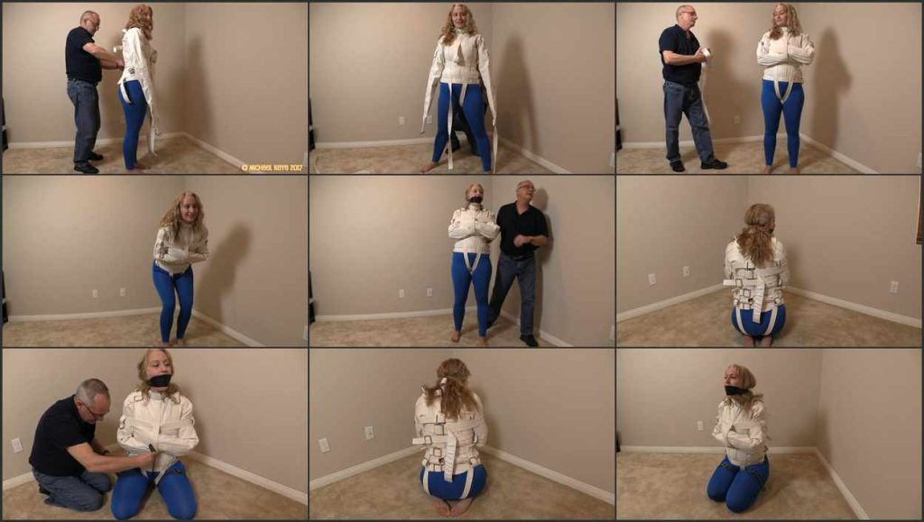 Starring Barbie. Who would think, immediately upon arrival back in the States from a vacation in Mexico, they would find themselves bound up inside a canvas Maxcita Psycho straitjacket? Well, visitors to my makeshift asylum for one. Willing to try the bondage options available, our journalist by day is eager to try my straitjacket suggestion, and it was not until strapping her arms in did conversation get around to, “Have you ever been in a straitjacket?” Her “no” answer surprised me as I knew she had been playing BDSM games since early adulthood. Good news nonetheless, as the submission of a willing prisoner to a new experience adds an extra little spark to the process. This is an easy going, spontaneous presentation with all the bondage done on screen. A nice moment occurs when the straitjacket hug makes the jacket a little too tight for Barbie and she asks for a little slack. All it took was an inch. “That’s better,” she said, still completely torso immobilized. I love it when they want to stay tied up, but just need a little adjustment to make it more fun. Once securely jacketed, Barbie gets a panel ball gag and is sent to her knees for straps keeping her in a frog tie. She is left alone to deal with it for a while, giving escape attempt the old college try, even though it was a futile endeavor. Barbie can deliver some nice gag talk when it suits her too. After a while of being relentlessly helpless she began to fight the gag so she could vocalize rescue desire.