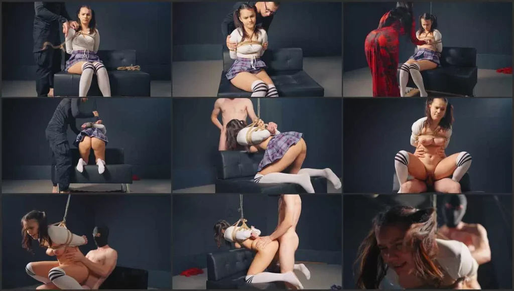 The bondage begins. Lola, dressed as a schoolgirl, looks around fearfully, excited about what might await her. The ropes are very tight, and touches are rough. Kalahari opens her breasts. He strictly turns her over and makes her to sit on her knees.