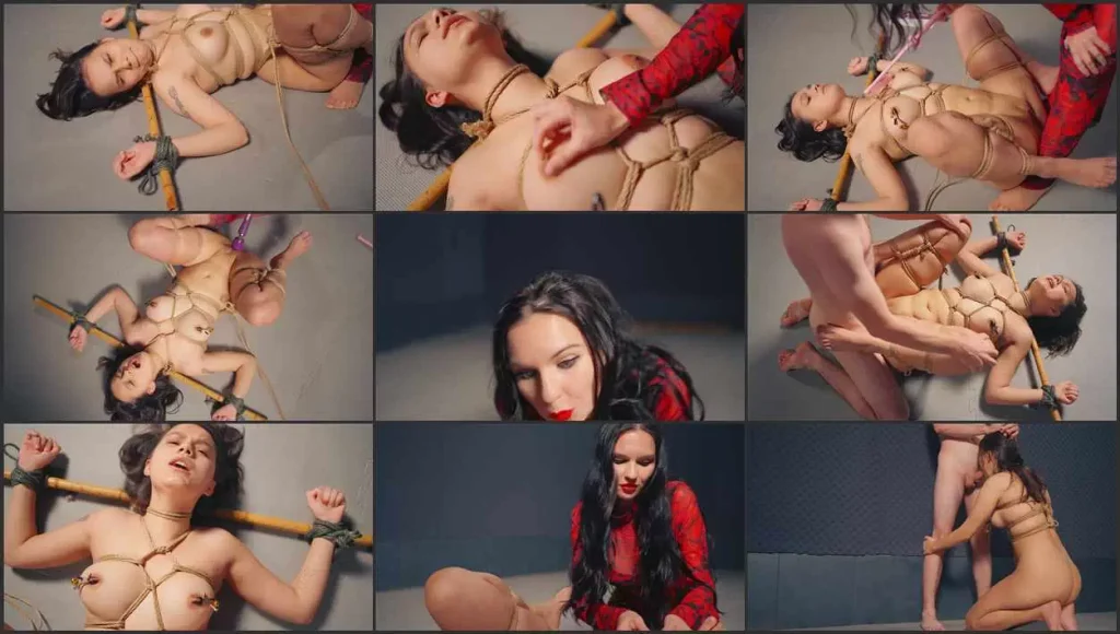 Lola loudly moans and screams during hardcore fucking right in ropes, and afterward, she crawls on her knees to Mr. Dick to finally suck his dick, submissively and emotionally!