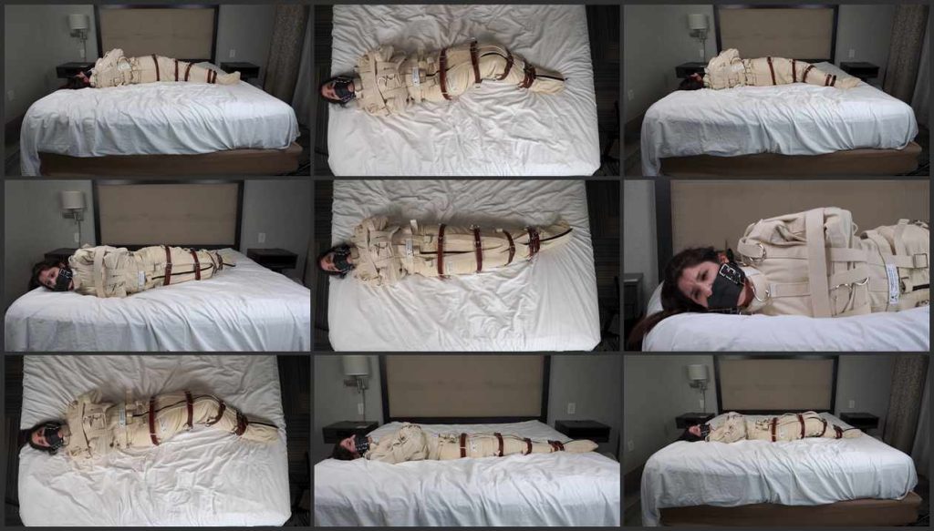 Arielle Lane is helpless in a new Maxcita Psycho II straitjacket with triple front sleeve loops and the Maxcita boot tightened with leather hospital belts. Muffled by a Bishop panel ballgag and unable to call out for help, all she can do is try to escape on her own. She rolls around and struggles on the bed but the canvas is unyielding. Seen from the side and from directly above as she fights for freedom.