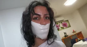Natalie finds herself in unknown surroundings and unsure how she got there. Her mouth has been taped shut, her legs and ankles bound. Her wrists are bound behind her with rope crushing her elbows as well. She feels a rope around her throat and finds that it’s tied to a pipe. Using her long nails she struggles with the rope eventually getting it loose so she can find a way out. She uses her bound arms to help inch herself forward to a doorway, trying to make as little noise as possible. She peers around the corner making sure no one is around and makes her way up into the next room. Natalie quickly scans the room, spots another doorway and starts scooting to it. Looking around again, she spots a hallway ahead and pushes herself to get there. She pauses for a moment to catch her breath and flex her hands, but knows she needs to move quick. Desperate to find an exit, she finds stairs. The damsel struggles with the steep steps, creaking as she carefully moves down one by one. Once downstairs she can see daylight and knows she is close, just a bit further to go. In her final push, the Hunter walks in to find his catch got a little too mobile. He pulls out her tits and lays her onto her stomach. He ties the rope around her throat to her ankles and leaves her to struggle. If she’s not careful she will choke herself. She whimpers and moans, flipping onto her side. After a while the Hunter returns, loosens the rope and stands her up to bring her down to the cold, dirty basement. The long haired beauty is now balanced on a block with her arms pulled taut in a strappado. She tries to shift her legs. groaning as her arms are aching. The Hunter returns again and begins removing her clothing, always making sure to keep the wench bound. Once he has her stripped he makes her put on a pair red stiletto pumps, then pulls her back into the cruel strappado. Then he harnesses her chest with paracord. Her cries are intense as he tightly wraps her breasts with the cord, cinching them. He presses a vibrating wand to her clit and she moans very loud, orgasming in no time. He spins her around and slides the wand into her very wet pussy as she continues to moan. She cums again and he slips a vinyl mini skirt in her before surprising her with another vibrating toy…