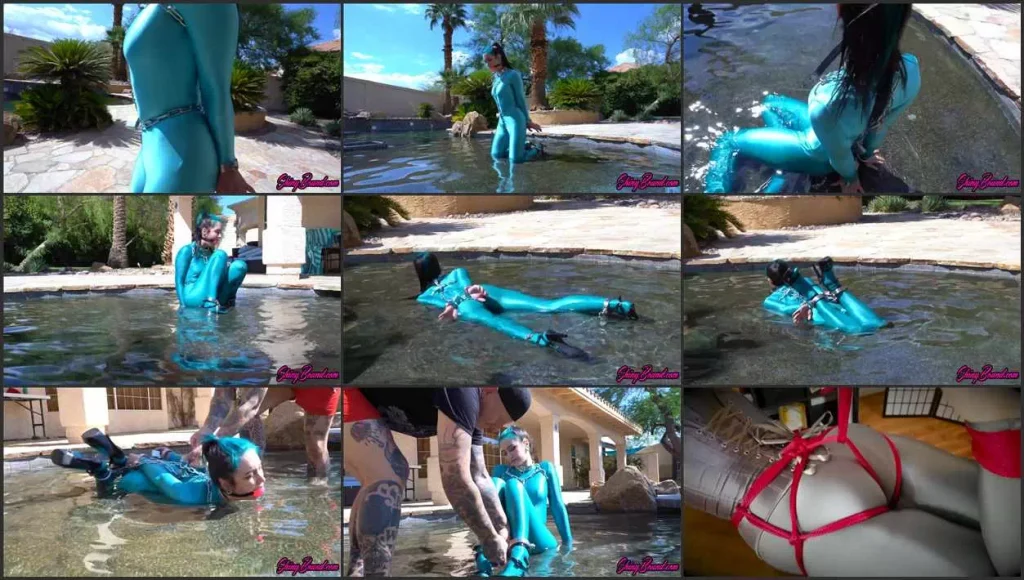 Sexy Lua Saturnii is chained up and cuffed in steel Next to the pool. As she further wades into the pool, her head to toe spandex catsuit becomes more and more wet. She flops down onto her butt and plays in the water seductively. Her catsuit is becoming more transparent and her nipples and tattoos are becoming visible through the silky material. Finally, she is tightly and inescapeably hogcuffed on her belly. She works to keep her face up out of the water so she can breathe. She struggles for us playfully, knowing there is absolutely no way out of this bondage except for with the key that’s in Shiny’s pocket…