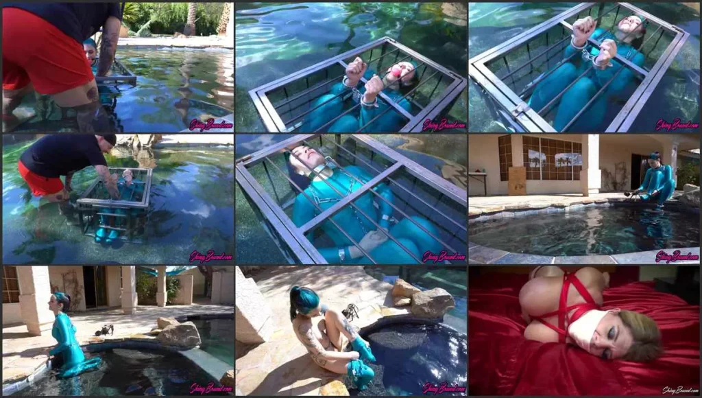 Sexy Lua Saturnii, now soaked in her spandex catsuit and weighed down with heavy steel chains and cuffs, is put into a cage in the pool. The cage sits just at the surface water level, so she is fulled submerged with only her face above water. She is ballgagged and the heavy chains and collar are dragging her down, so she must concentrate on holding herself up. She strains to keep her face above water and to breathe through her nose. Now becoming exhausted and getting extremely cold, her handcuffs are released and her collar is locked to the top of the cage so she can rest. Shiny reaches in and pulls on her crotch chain to liven her up. Finally when her teeth start to chatter and she needs to be released, the cage is opened, the chains are unlocked and removed, and she is allowed to peel off her wet catsuit and get into the hot tub to warm herself.