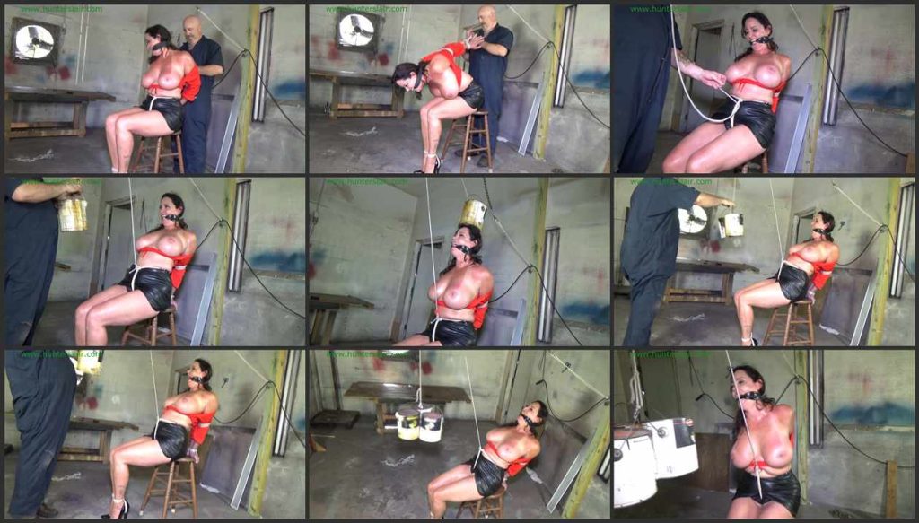 Busty Christina has fallen into the Hunter’s lair and finds herself sitting on a stool in his dirty, grudgy lair tightly bound and gagged. Her wrists are tied behind her back, her slender ankles are bound and a tight crotch rope is pulled between her legs. Black elastic bandage is pulled between her lips and wrapped tightly around her head to keep her quiet. But Christina refuses to keep quiet and struggles desperately to free her wrists from the ropes. She considers hopping away but the Hunter has tied her 6 inch stiletto heels on her feet, she can barely walk in the them with her ankles free so there is no way she will attempt to hop with her ankles tied together. The Hunter comes back in with a big stupid grin on his face and Christina begins by swearing and cursing at him through her gag, demanding to be free. But the Hunter tells her that first she needs the full lair experience, he grabs some rope and goes behind her and pushes her elbows together behind her back with his hands. He laughs as she gasps into her gag then her wraps ropes around her upper arms and as she protests through her gag he slams her elbows together behind her back and ties them tightly together. He watches her struggle in the ropes then grabs the front of her red peasant blouse and pulls her big tits out of her blouse. Christina demands he stop and begins to curse and swear again. The Hunter pulls a roll of shiny black tape out of his pocket and wraps it tightly over the elastic bandage already pulled tightly between her lips.