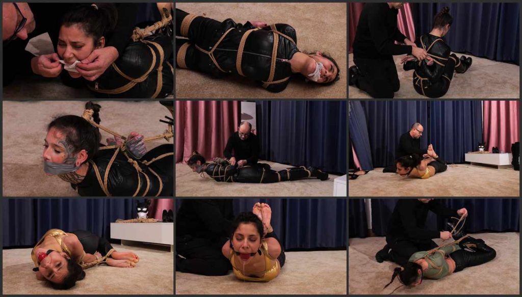 Both Mayla and Numa are wearing leather jackets, leggings and knee high boots. They are going to be hogtied awfully tight, their arms crushed, their shoulders aching and their back bending to the limit and their head pulled back by their hairs. First is Mayla turn in boxtie hogtie frogtie with crotch rope and cloth stuffed in her mouth, then Numa gets some sort of hammerlock/reverse prayer tie, she can pull her wrists really high behind her back and still be able to bend her back like crazy, that will be used against her as the crotch rope cuts deep between her legs and her mouth is kept shut by a wraparound pvc tape gag. After we have seen both girls helpless enough with their arms crossed is time for some elbows touching hogties, where Mayla gets the barefoot, bigtoes and hairs tied to her elbows to keep her stuck in a a complete back arch while Numa keeps her boots and is made completely unable to move around with her legs widely crossed and elbows touching behind her back, she is clearly left without any stamina from the previous tie and moans and suffer in despair for all her time in this second ordeal.