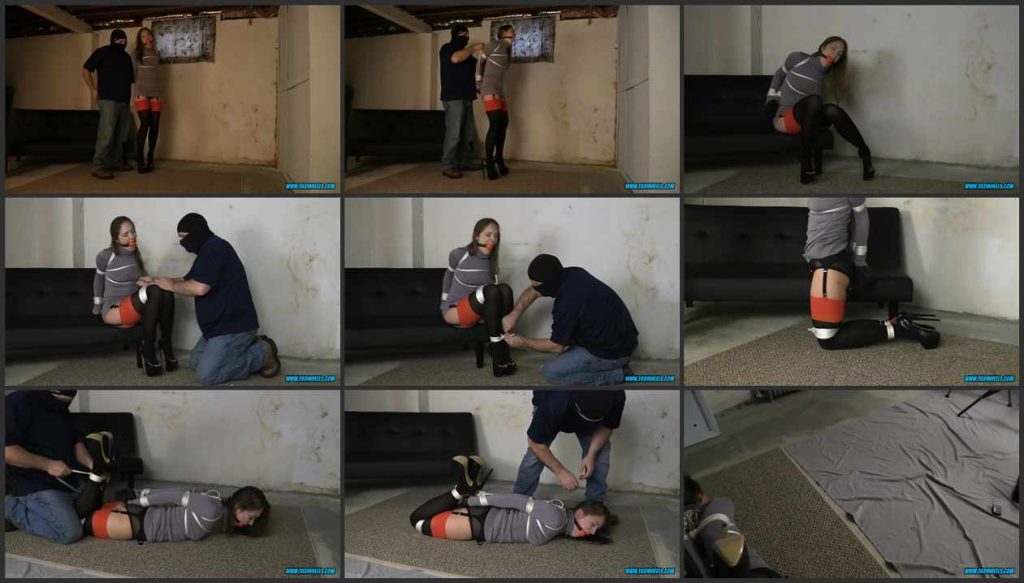 Sexy Rachel Adams is captured and taken back to the basement ddungeon for bondage torment! She is dressed in fantastic attire, turtleneck sweaterdress, garters and stockings and incredible, skyscxxxxr, platform high heels! She was definitely looking to be tightly bound and gagged! Her captor quickly takes her under complete control, she is no match against his dominant power! He methodically bind his captive beauty until she can barley take it anymore! To his delight, sexy rachel is suffering at his hands! Once fully bound, Rachel struggles and suffers to his delight! He finally ropes her up into a tight hogtie and leaves her on the dungeon floor to suffer and struggle for his amusement! Shes not going anywhere for long, long time!