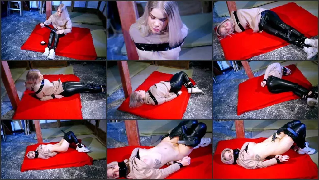 A gorgeous young beauty in a casual hoodie and sneakers finds herself tightly bound in shiny black duct tape. Every limb is wrapped, her body sealed and restrained, leaving her completely helpless. The contrast of soft streetwear against harsh tape makes this a stunning bondage.