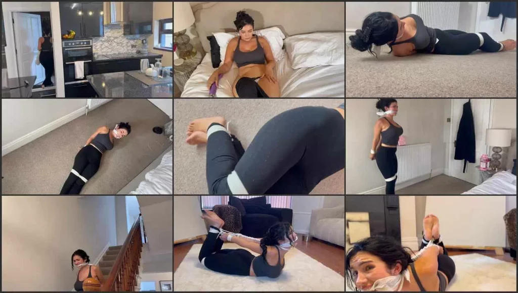 Tatti finds herself bound tightly on the bedroom floor, her hands secured behind her back with white rope, her knees and ankles also tightly tied. A cleave gag muffles her moans as she wriggles helplessly, drooling slightly and making the gag soaking wet! Desperate, she manages to struggle to her feet and begins hopping toward the front door, hoping to attract someone’s attention for help…