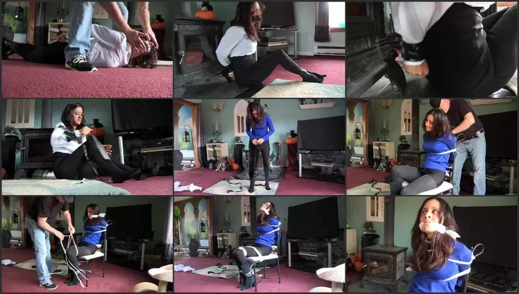 Jamie feels that she has been working very hard at Dave’s firm doing a lot of overtime, so she decides to ask for a raise. Dave refuses, pointing out that she would not have to do so much overtime if she was not so slow at her job. Jamie is outraged, and in the heat of the moment tells Dave that maybe he should not have let her handle his personal accounts because she now knows about his dirty little secrets. Dave leaves the room leaving Jamie quietly fuming. She believes he has gone to get his checkbook to bribe her to keep quiet, but instead he returns and ties her up with duct tape, securing her wrists and ankles before he attempts to gag her. Jamie tries to fight him off but there is nothing she can do to stop him applying several strips of very sticky duct tape over her mouth. After Dave leaves the room, wondering what he is going to do about this troublesome secretary, Jamie works her way over to the iron wood stove and begins sawing at the tape binding her wrists on the corner of one of the stove’s legs. She works furiously, aware that she must escape before Dave decides to take more drastic action. Just when she thinks the tape will never part, it finally does! She ungags herself and unwraps the tape binding her ankles, then makes a run for her car. Alas, Dave is already there, planning to move her vehicle somewhere more discrete. He takes Jamie back to the house, makes her remove her blouse and put on a sexy sweater and a pair of boots, then ties her to a chair and cleave gags her. Once again, Jamie does her best to escape, but the ropes are tight and she cant reach anything that might help her.