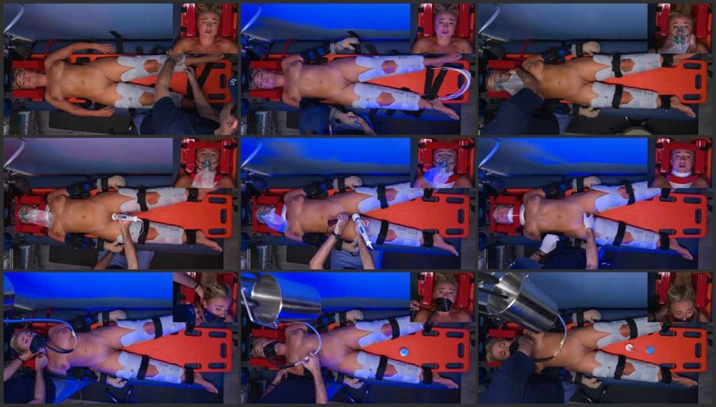 Zoey Ziptie had an accident and fractured her neck. Unable to move, she is place on a medical board by the paramedic in the ambulance as she is being driven to the hospital. In order to examine her fully for injuries, the paramedic proceeds remove her clothing until she is stark naked. To secure the patient, he fastens her down, strapping her arms and legs to the board, strapping her head into the head brace, adding leg, arm, and wrist splints, bandaging her hands to further restrict movement. Once she is fully secured, the paramedic snaps her neck back into place, enabling her to no longer be paralyzed, while the medical restraints keep her firmly in place so she doesn’t further injure herself, adding an oxygen mask to help her breathe.