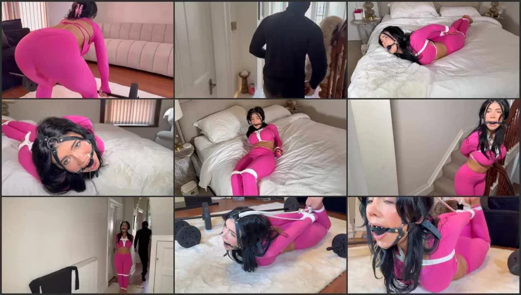 Tatti is now tied on her bed in her gym outfit, she has an over the head ballgag and her feet, knees and wrists have been tied! She wriggles around the bed as drool drips from her mouth! Her lips are accentuated and looking so plump as she bites down on the large gag. She gag talks and wriggles her way off the bed and manages to get to her feet. She bounces to the door and opens it!…