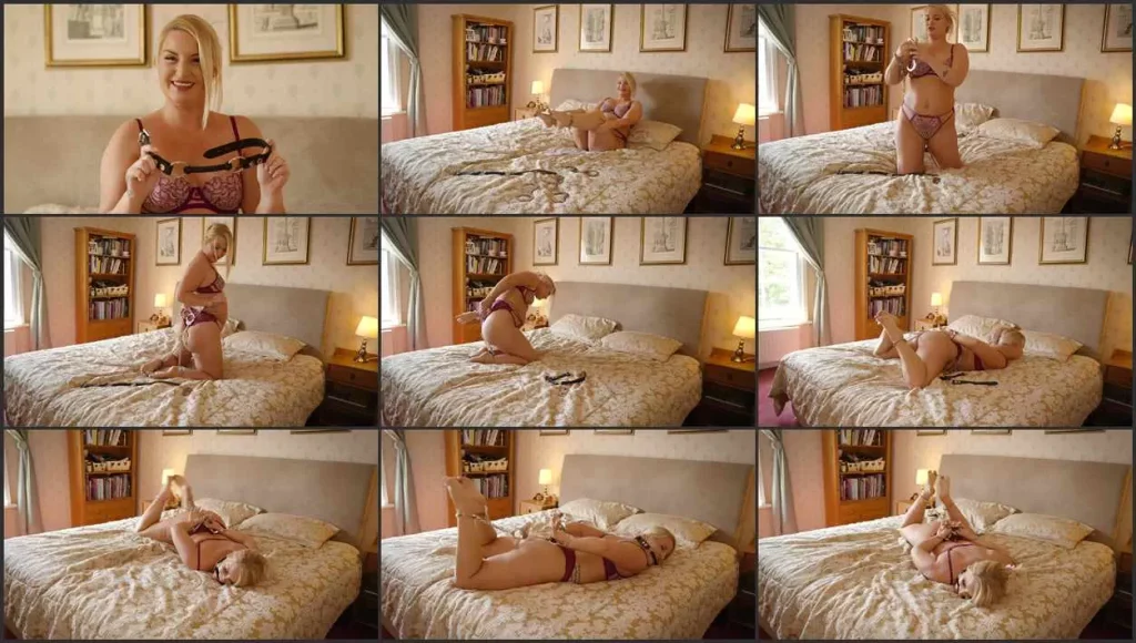 Delightful soft-spoken Irish stunner Essie finds a range of metal bondage gear laid out for some fun time. Two sets of articulated handcuffs, a set of leg irons with a longer chain, and some thumb/toe cuffs. Plus a bit gag, of course! She sets to locking herself in self bondage, talking through it as she does, enjoying the feel of the cold steel, the restriction and restraint, and the close confinement of a hog-shackle. Unfortunately she forgot the gag until too late- with her thumbs cuffed and wrists locked to her ankles, she just can’t get it in. Would I oblige her? Well, it would be rude not to!