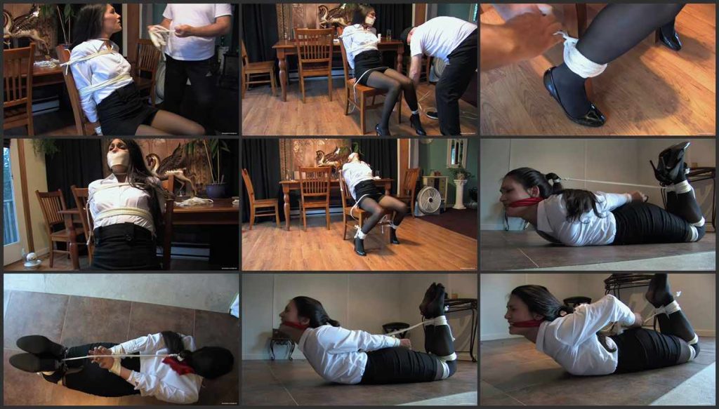 Jade has been grabbed and taken to a remote location. We join the action as Jade is pushed down onto a chair before her captor proceeds to tie her to it, binging wrists, ankles and torso to make sure she is secure. When Jade won’t shut up, he pushes a cloth into her mouth and seals it in with surgical tape. He leaves Jade alone to struggle, and struggle she does in a desperate attempt top escape. However, the ropes holding her wrists are tight and there is little chance of her getting out of her restraints. Later, Jade is moved to another room, this time with her wrists, thighs, calves and ankles bound. She is also in a hogtie with the rope from her feet to her hair, so that every time she tries to straighten her legs she pulls her own hair. It’s a very uncomfortable position, but there is nothing Jade can do to mitigate her discomfort. Before leaving her for the night, her captor applies a cleave gag to stop her calling out. In his absence, Jade once again tries to get free but the ropes are too tightly tied and her fingers are already numb. It’s going to be a very, very long night.