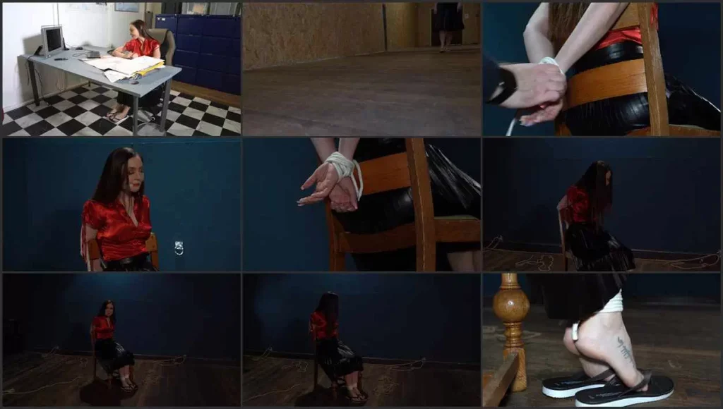 Jasmine is working away when she asked to go to a meeting at a warehouse. Tied to a chair and gaged with a thin strip of cloth, she struggles to get free. Wearing flip flops doesnt help.