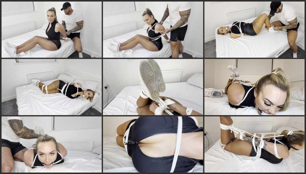 Jenna getting turned on slowly gets tied up starting with her wrists, elbows and encasing her breasts all whilst she is still fully clothed in a tight black zipped sports top, tights with black skirt and her white sock and trainers. He then decides to take Jenna further through her paces and places a big white ballgag over her mouth and secures it tight.