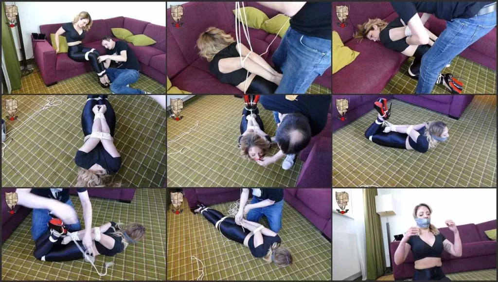 Alba likes Bondage and Alba likes it tight! Dressed in shiny tight disco pants and heels, sexy Alba Zevon is about to get an extra treatment: Jim Hunter style tied arms in an even more tight hogtie, extra tight. She gets gagged with a big red soft ball and heavily tape gagged. No escape out of that ultimate hogtie! What is that Jim Hunter technique? See for yourself! Onscreen Tying!